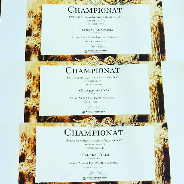 Jo, men visst känns det lite extra roligt när de tre syskonen från Olenkas A-kull, som vi följt sedan den dag de föddes, och själva tränat och tävlat med, har blivit stora duktiga hundar och fått ut sina Polarhundschampionat (trillingarna, som vi kallar dem ibland). Olenkas Akim, Anastasia och Alyona är nu också registrerade som SE(POLAR)CH för sina meriter i drag :)